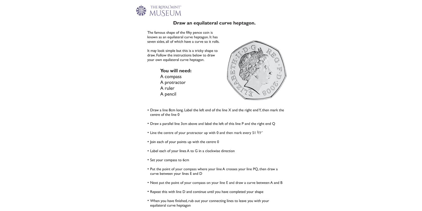 In this workshop pupils will learn more about the development of the fifty pence piece and use their maths skills to complete a technical drawing of a curved equilateral heptagon.