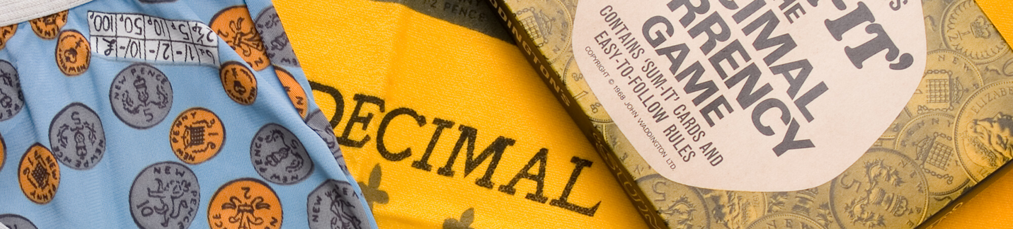 The process of decimalisation generated a substantial amount of printed information produced to make the British public aware of the enormous change. Official newsletters, and information leaflets, posters and cardboard stands were disseminated far and wide. In addition, there were what might be called novelty items that have survived, including a decimalisation board game by Waddingtons, a set of playing cards, a duster and, of all things, a pair of decimalisation underpants. Gifts of such objects continue to be donated to the Museum enhancing the collection as a thorough social-history record of this important change to the currency.