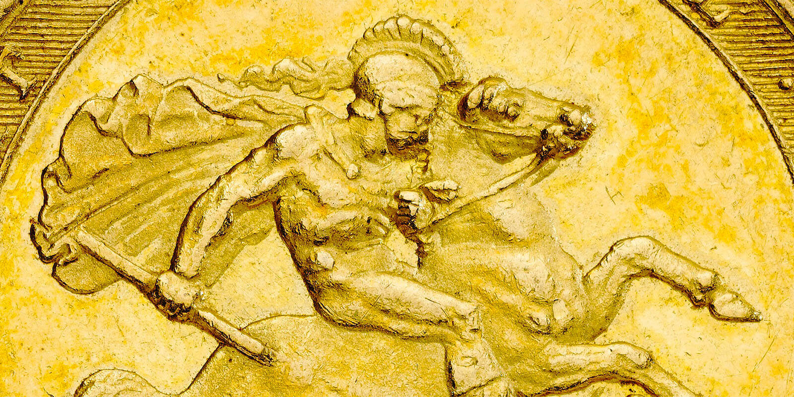 Taking as his theme the legend of St George slaying the dragon, Pistrucci produced an iconic design for the reverse of the sovereign. Heavily influenced by his Italian heritage, he drew inspiration from classical art and sculpture. On the obverse, the portrait of George III depicts the king in the style of a Roman emperor, crowned by a wreath of laurel and appearing to be a vigorous, robust-looking man of middle age. This contrasted sharply with reality as by 1817, George III was well into his 70s – bald with a long white beard – and his failing physical and mental health had confined him to his rooms for many years.