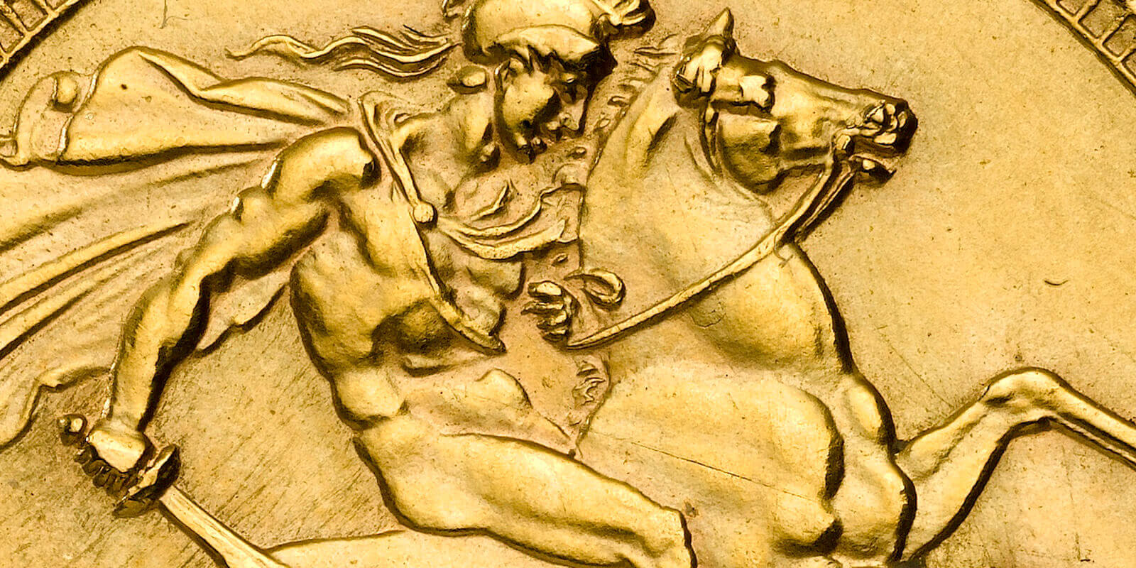The designs on the George V sovereigns remained largely unchanged from those struck during his father’s reign, continuing to feature St George’s eternal struggle against the dragon, and it was to the Australian artist Bertram Mackennal, who the Royal Mint turned to prepare a portrait of the king for the obverse. Production of sovereigns continued in London until 1917 but then ceased until 1925. In that same year, the Bank of England returned a number of underweight sovereigns to the Royal Mint for recoinage that later were sent back to the Bank’s vaults.
