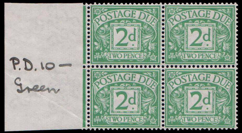 The Royal Mint Museum holds a volume titled “1911 Stamp Plates Book 1” which chronicles the manufacture of the printing plates made by the Mint including, on pages 41-45, the Postage Due printing plates. The records show that four plates of each value: ½d, 1d, 2d, and 5d were delivered in 1914. These four denominations were issued on 20 Apr 1914: ½d (return-to-sender rate), 1d (double the postcard rate), 2d (double the letter rate), and 5d (double the foreign letter rate).